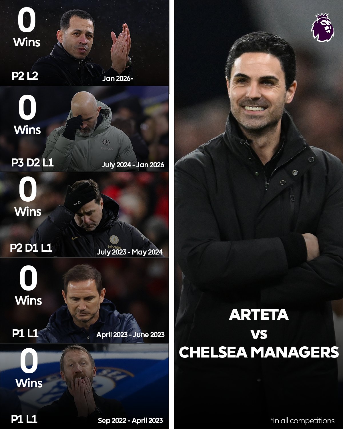 據(jù)英超官方統(tǒng)計(jì),切爾西近5任主教練,均未能對(duì)阿森納取得勝利,這期間阿森納的主教練一直是阿爾特塔。