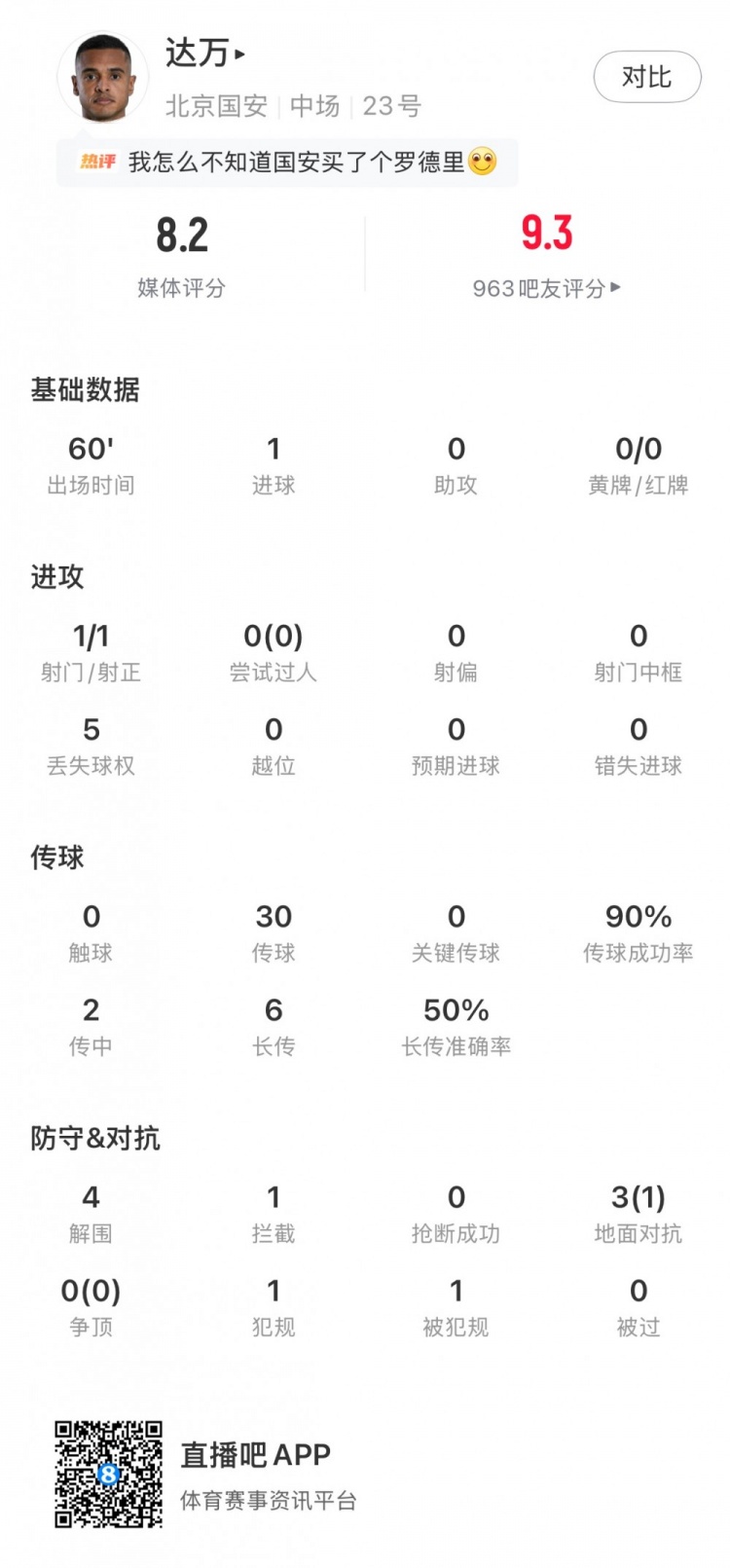 本場比賽巴西中場達萬為國安首發(fā)出戰(zhàn)60分鐘,并在第31分鐘接塞爾吉尼奧助攻世界波破門,為球隊首開紀錄。賽后他獲得8.2分的全場最高分。