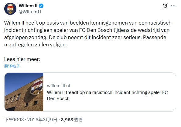 這場比賽于北京時(shí)間3月8日21:30開球,23:27左右完賽。賽后不到24小時(shí),北京時(shí)間3月9日22:13,威廉二世俱樂部發(fā)布公告表示已通過視頻得知此次歧視事件,俱樂部高度重視并立即向鄧伯什以及王博豪致歉,現(xiàn)已鎖定歧視者并將采取相應(yīng)的措施。