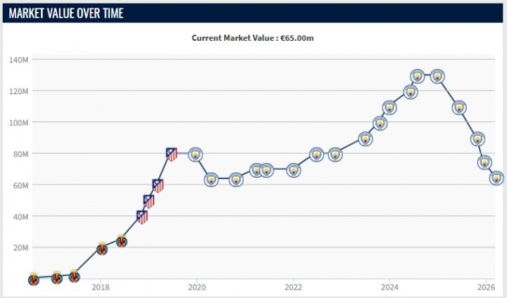 羅德里如今的身價只有1年多之前的一半,遭遇四連降。