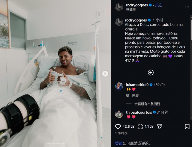 手術成功!羅德里戈:一個全新的我誕生了,感謝每一條關愛的信息