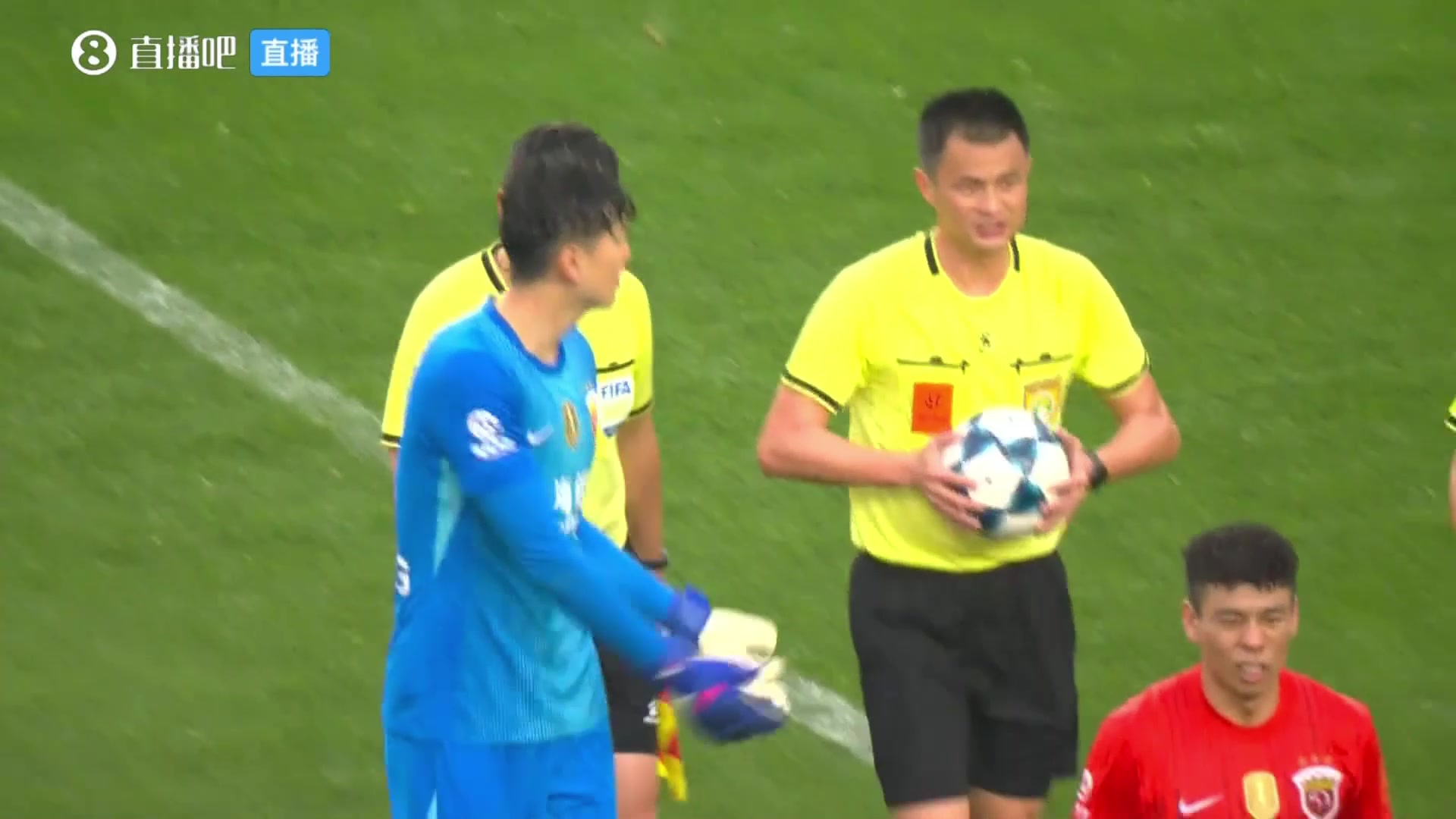 氣不足?上半場結(jié)束后,顏駿凌找到主裁判投訴本場用球問題