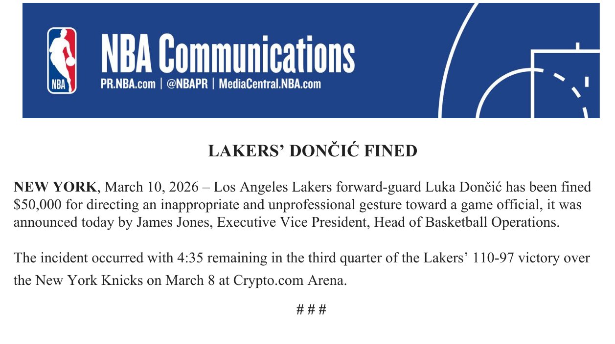 直播吧03月11日訊 今日,NBA官方宣布,洛杉磯湖人隊前鋒兼后衛(wèi)盧卡·東契奇因向比賽裁判做出不當且不職業(yè)的手勢,被籃球運營執(zhí)行副總裁詹姆斯·瓊斯宣布處以5萬美元罰款。