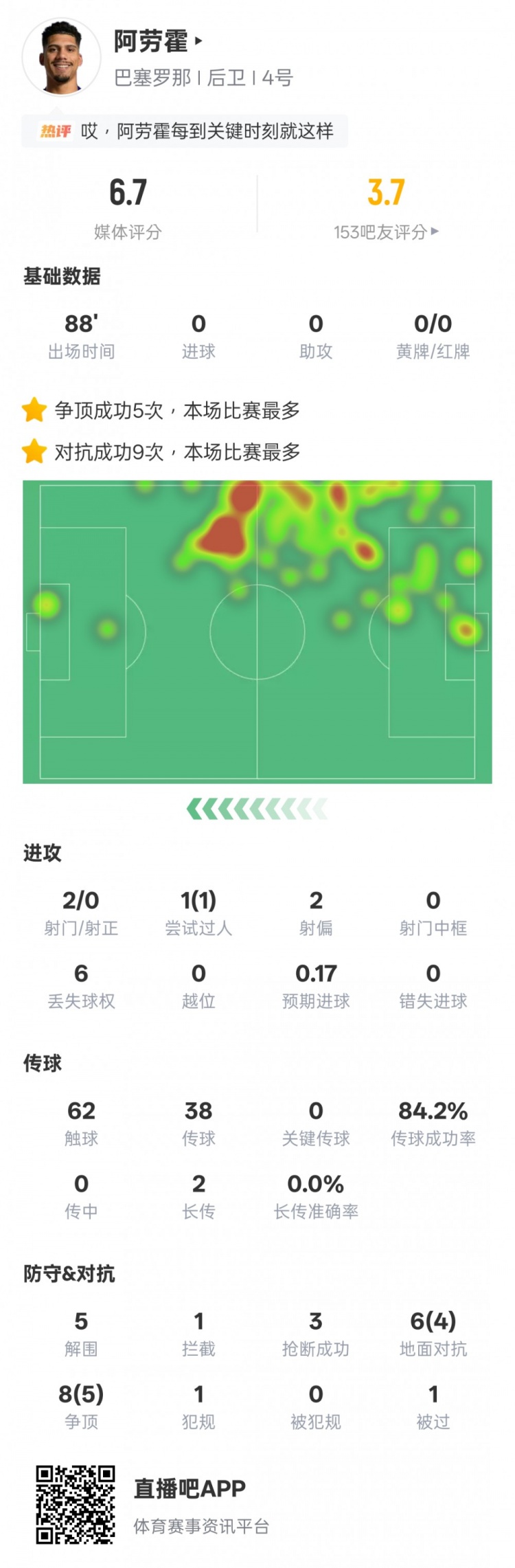 阿勞霍本場比賽具體數(shù)據(jù)如下: