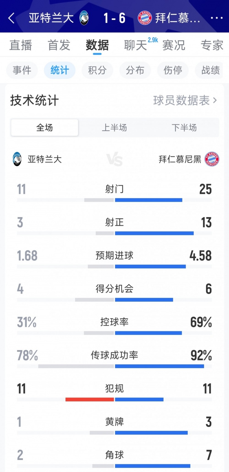 直播吧3月11日訊 在本輪歐冠淘汰賽,拜仁6-1擊敗亞特蘭大,以下為雙方全場(chǎng)數(shù)據(jù)對(duì)比: