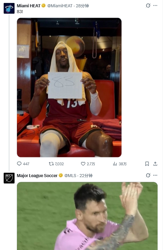 邁阿密熱火官推發(fā)布阿德巴約手舉83分照片,美職聯(lián)官推評論配上了梅西鼓掌的動圖。