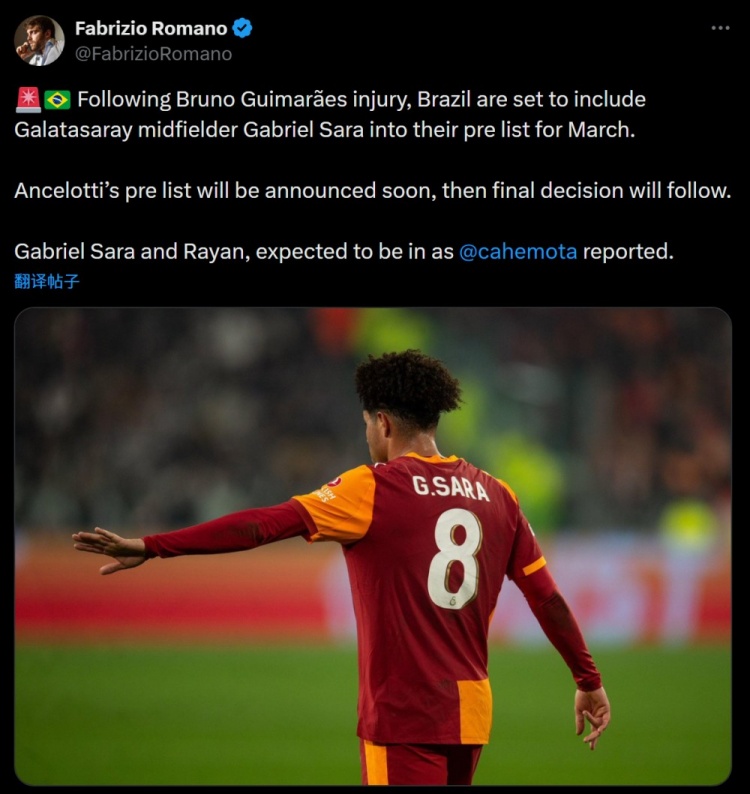 由于吉馬良斯受傷,加拉塔薩雷中場(chǎng)薩拉預(yù)計(jì)將入選巴西隊(duì)初選名單,冬窗加盟伯恩茅斯的19歲前鋒拉揚(yáng)也將入選。