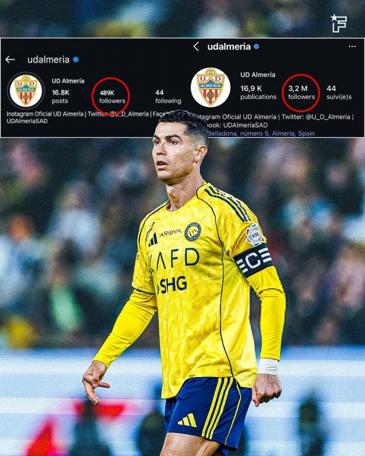 直播吧03月11日訊 據(jù)羅馬諾報(bào)道,C羅收購(gòu)的阿爾梅里亞俱樂部ins賬號(hào)關(guān)注人數(shù)已達(dá)320萬。