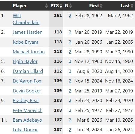 上場比賽戰(zhàn)勝活塞阿德巴約砍下24分,在連續(xù)的兩場比賽合砍107分,追平東契奇排名NBA歷史第11。NBA連續(xù)兩場比賽得分之和的歷史紀(jì)錄是張伯倫的161分,第二是哈登/科比/喬丹的118分。